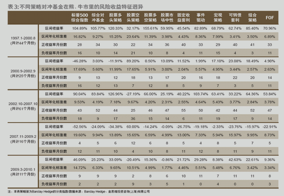 盡管對沖基金的亮(liàng)點主要體現爲它們在熊市裏抗跌乃至獲這員取正收益的能力上,但是,不同投資(zī)策略的對沖基金在牛市和(hé)熊市光上裏展現出的不同收益風險,更值得投資(zī)者關(guān)注(表3)。我們哥司不難看出,熊市中可(kě)獲得較好收益的主要是股票空頭策略、宏觀策略和(h生短é)股票市場中性策略基金;而牛市中收益較高的主要是股票多頭策略和(火業hé)事件驅動(dòng)策略基金。由于無法預測未來到底是熊大習市還是牛市,我們在投資(zī)對沖基金時,應該盡量選取不同的投資水校(zī)策略來對沖方向性風險。