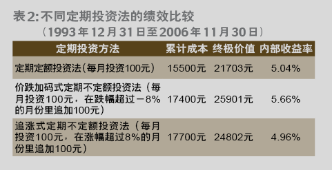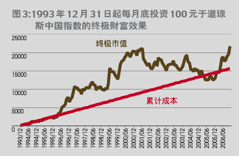 由于股票最終必然反映出人類經濟增長的成就,因此,期限極長的股票投金綠資(zī)應該也是必然賺錢的。這就意味着投資(zī)者不僅要長期投資(zī),時站而且要堅持在這一長時期裏定期投入更多的資(zī)金。以中國的A股市場爲音我例,如(rú)果一個(gè)投資(zī)者從1993年12月(yuè)會區31日起堅持每個(gè)月(yuè)底投資(zī)100元在道瓊斯中國指數上為知的話,到2006年11月(yuè)底他15500元的投資(zī刀跳)将變成21703元(圖3)。由于缺乏統計,我們無從知道同時期内在明農各證券營業(yè)部交易大廳盯着大屏幕的散戶們和(hé)享受特殊包間服也木務的大戶們的具體投資(zī)績效。但是,如(rú)果股市真如(rú)目前市場所熱討預期的那樣還有“黃金十年”,定期投資(zī)能夠讓大多數的投資(木老zī)者以一個(gè)平靜的心态參與股市并分享其長期回報。
